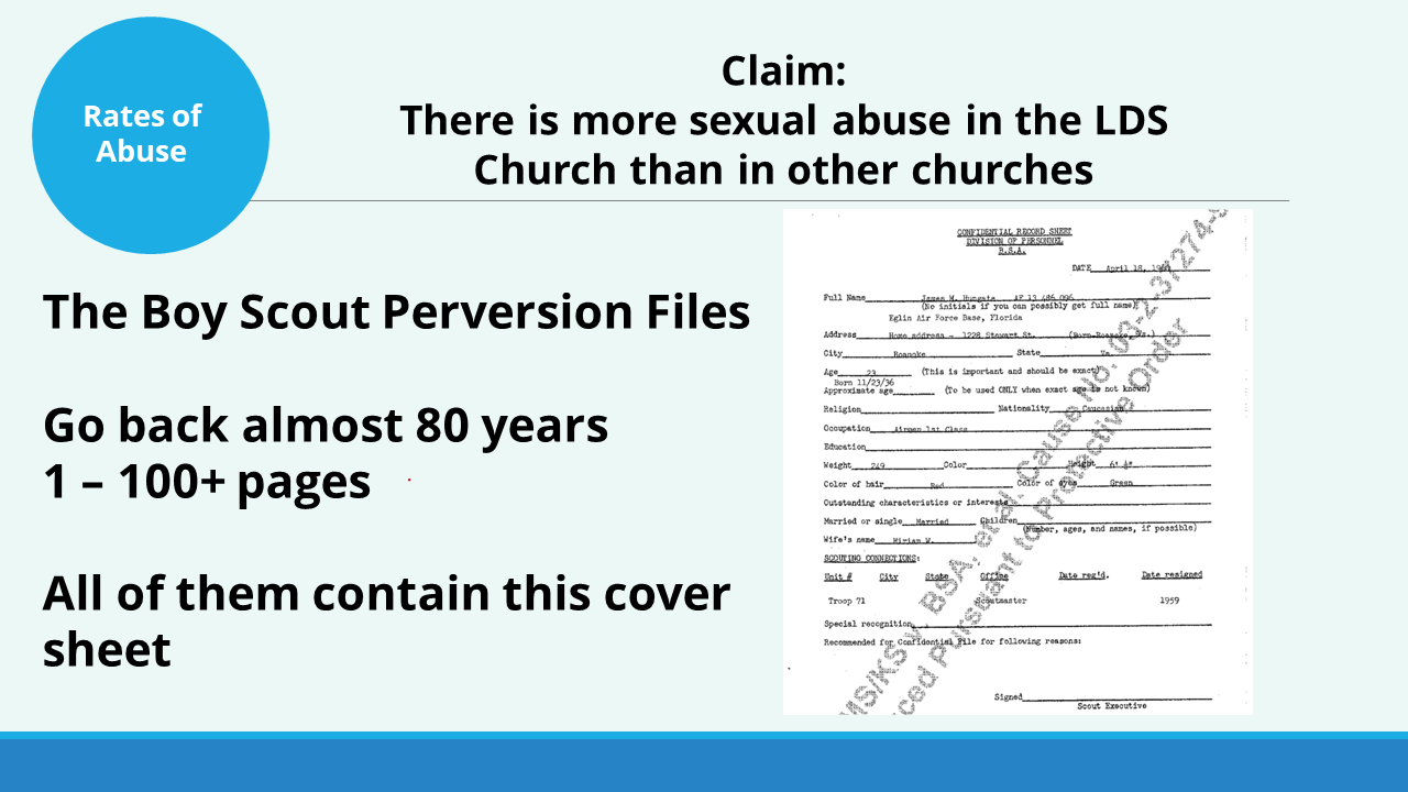 Now that is not something to get so excited about. ‘Yay, only 5% were abusing.’ It’s still a terrible number, the number should still be zero. However, 5.16%: statistically, that means we’re seeing 75% less abuse in an LDS troop than in a non-LDS troop.