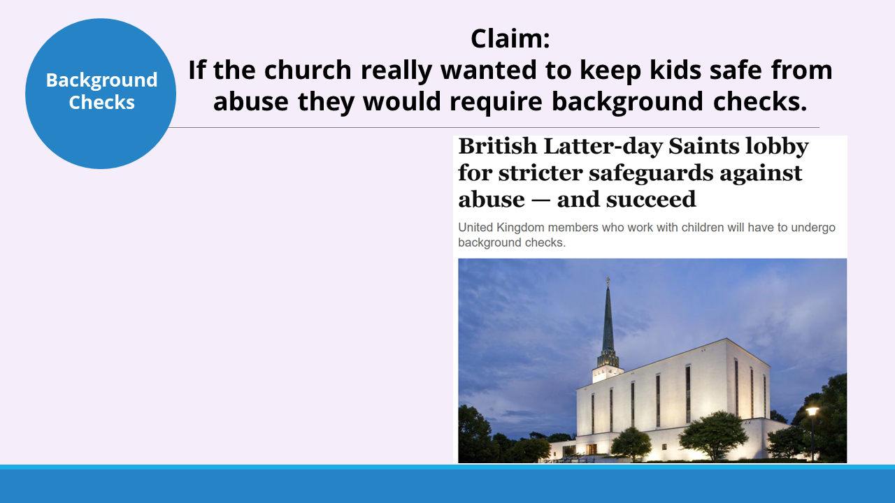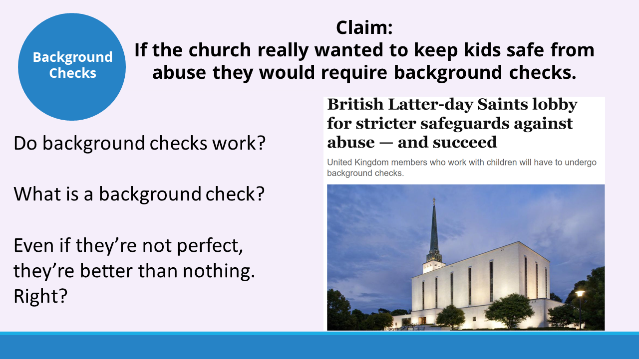 We’re going to take up the next question, which the claim is “if the church really wanted to protect kids, we would require universal background checks.” You might have heard recently in the news, the saints in England had kind of a grass-roots movement to require the church to do background checks. I love their activism. I love their hearts for this.