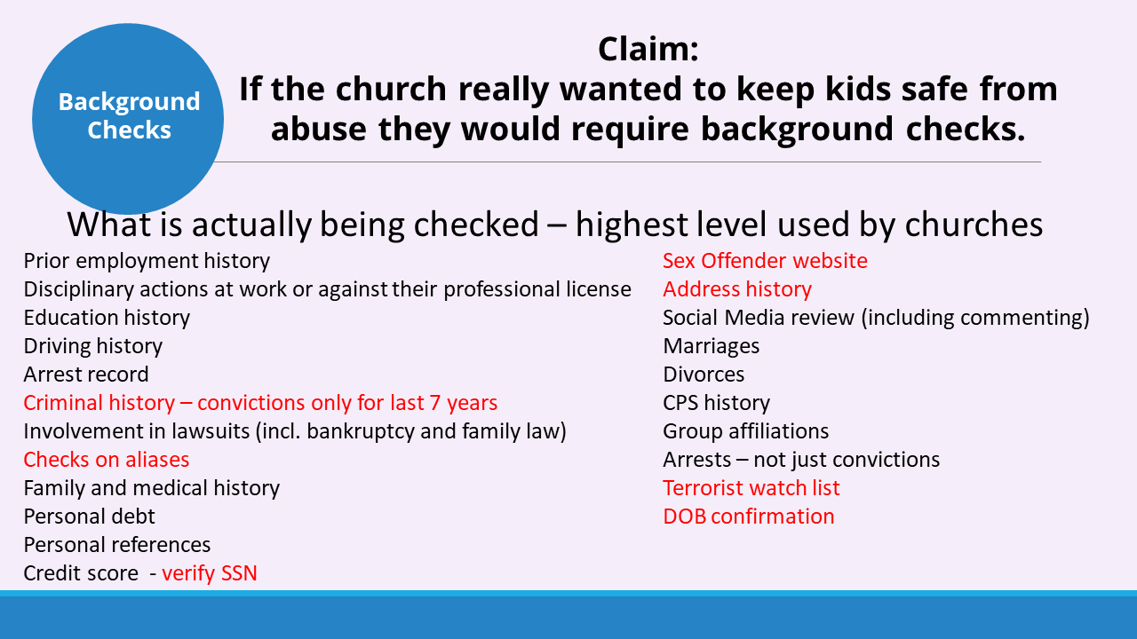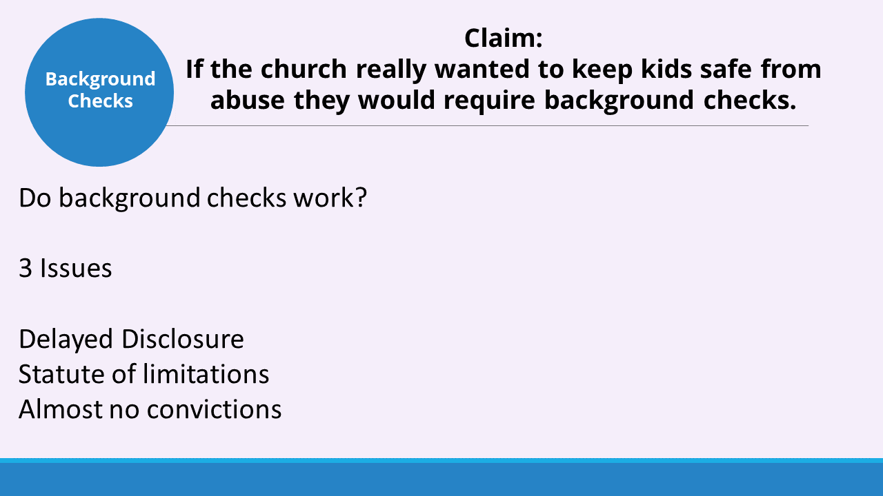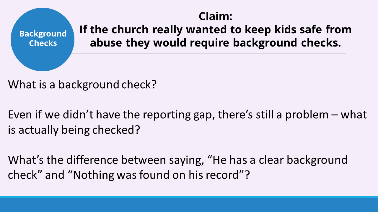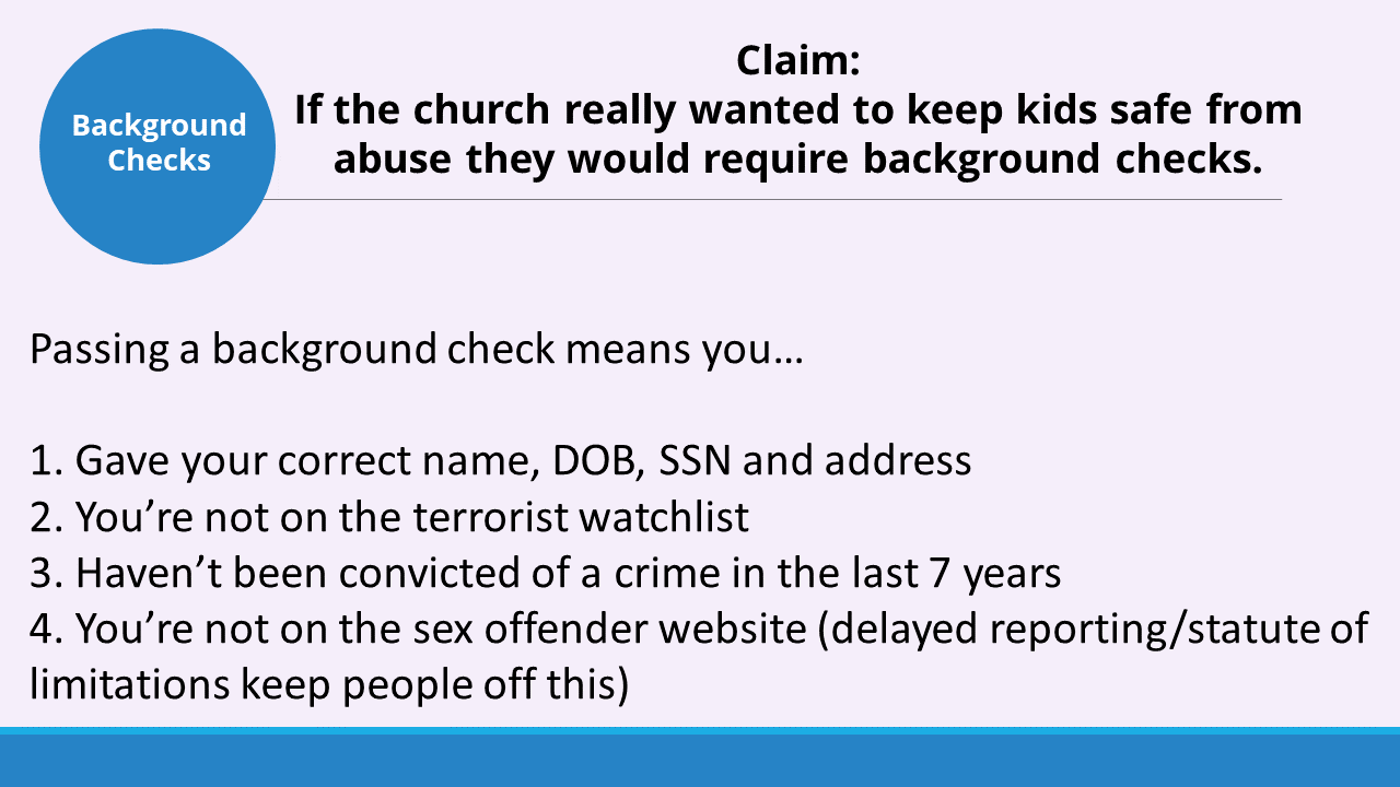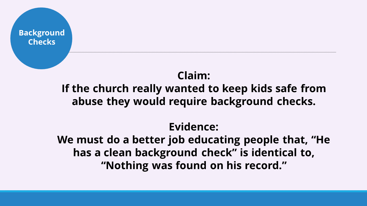 So, the claim, “If the church really wanted to keep kids safe from abuse, they would require background checks.” Here’s my evidence. We must do a better job educating people that “he has a clean background check” is identical to “we didn’t find anything on his record,” because it’s going to clue parents in differently about their responsibility of still watching over their own children.