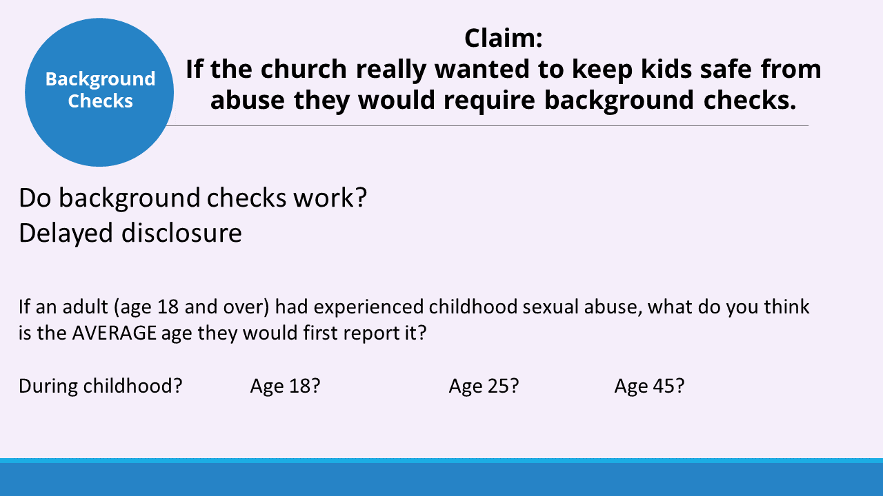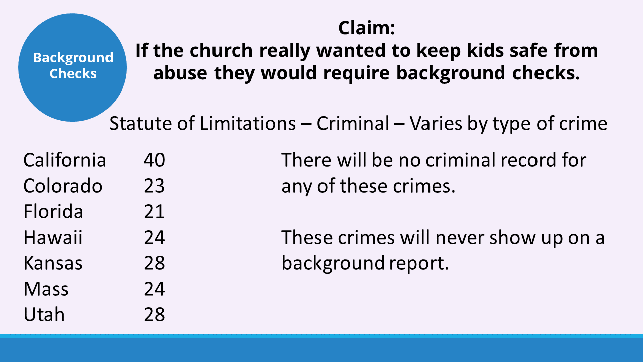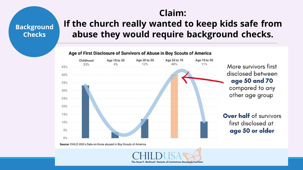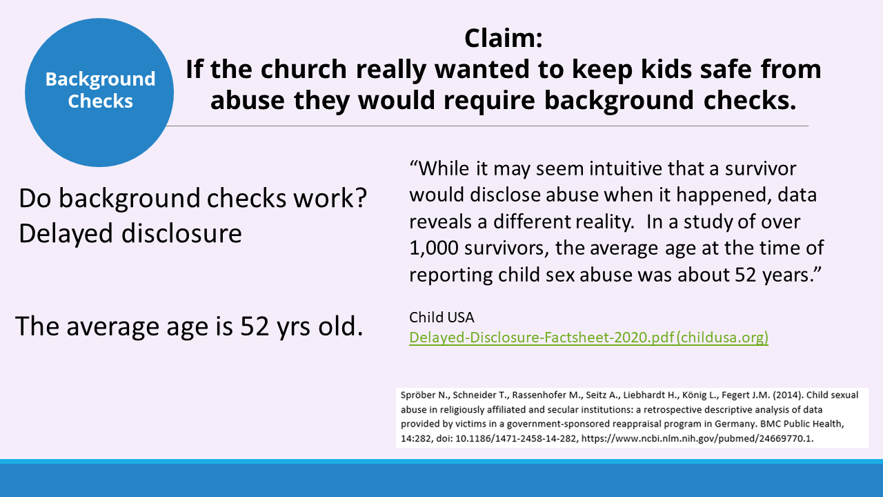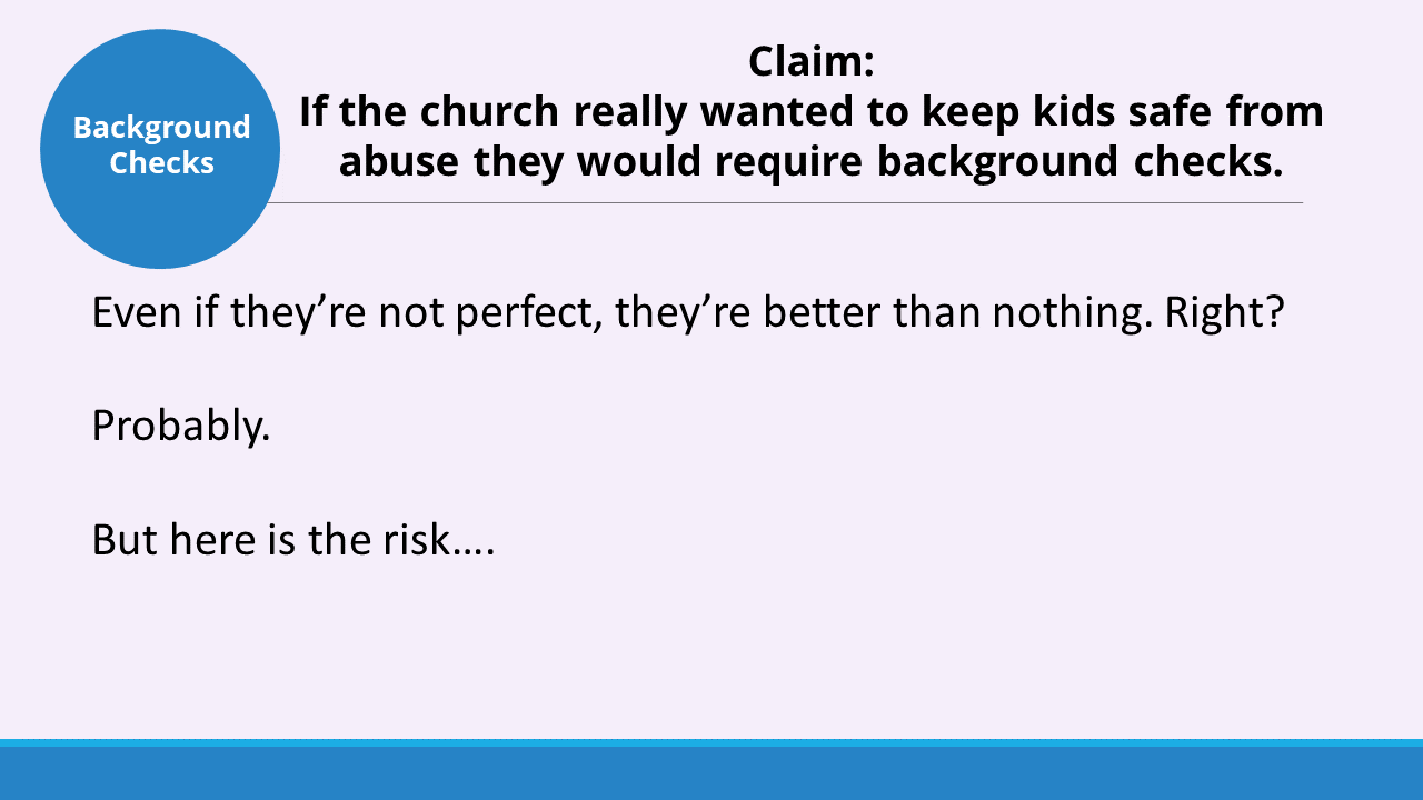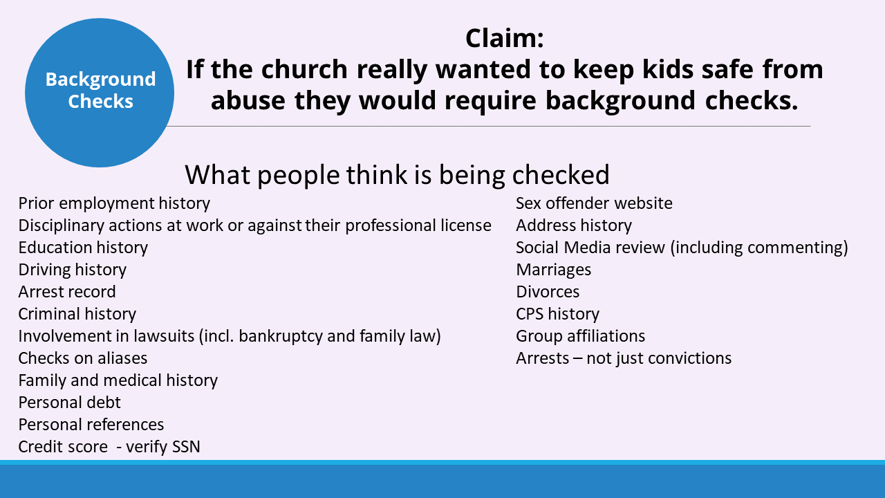 So, the claim, “If the church really wanted to keep kids safe from abuse, they would require background checks.” Here’s my evidence. We must do a better job educating people that “he has a clean background check” is identical to “we didn’t find anything on his record,” because it’s going to clue parents in differently about their responsibility of still watching over their own children.