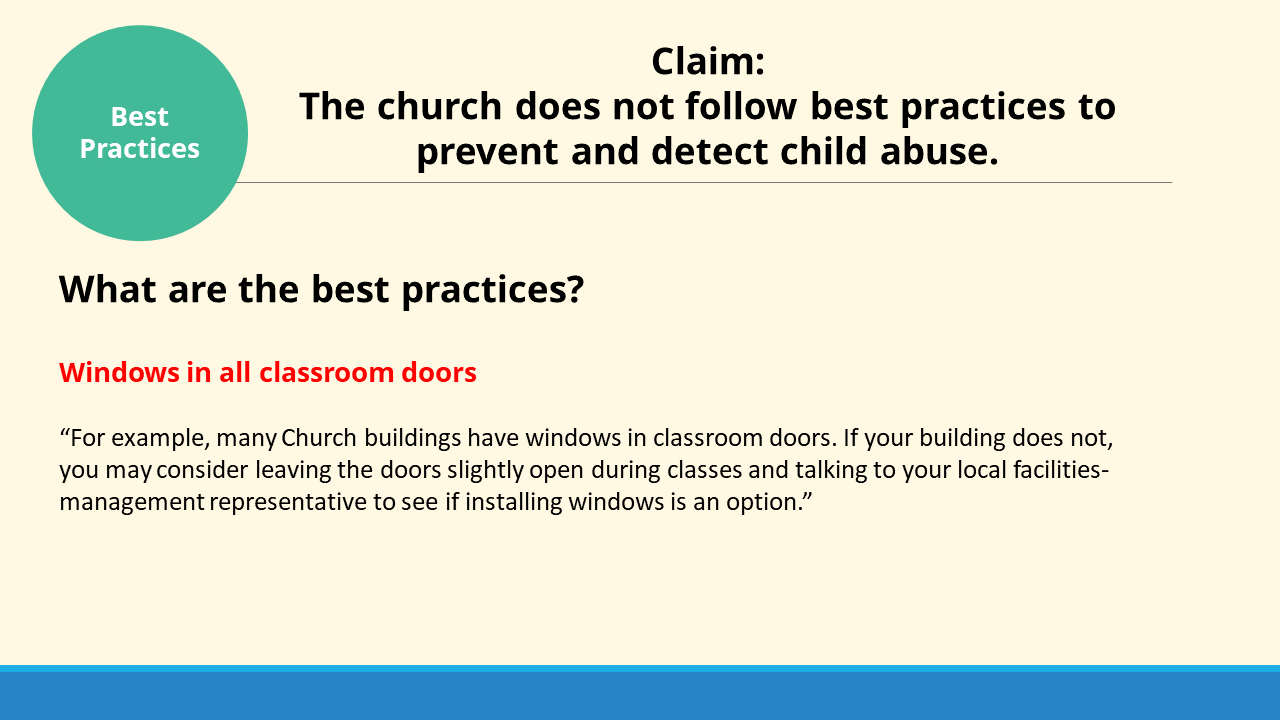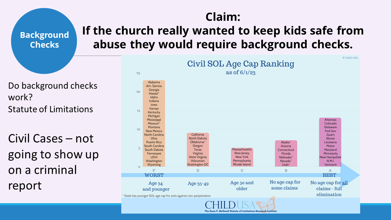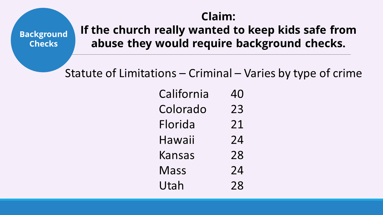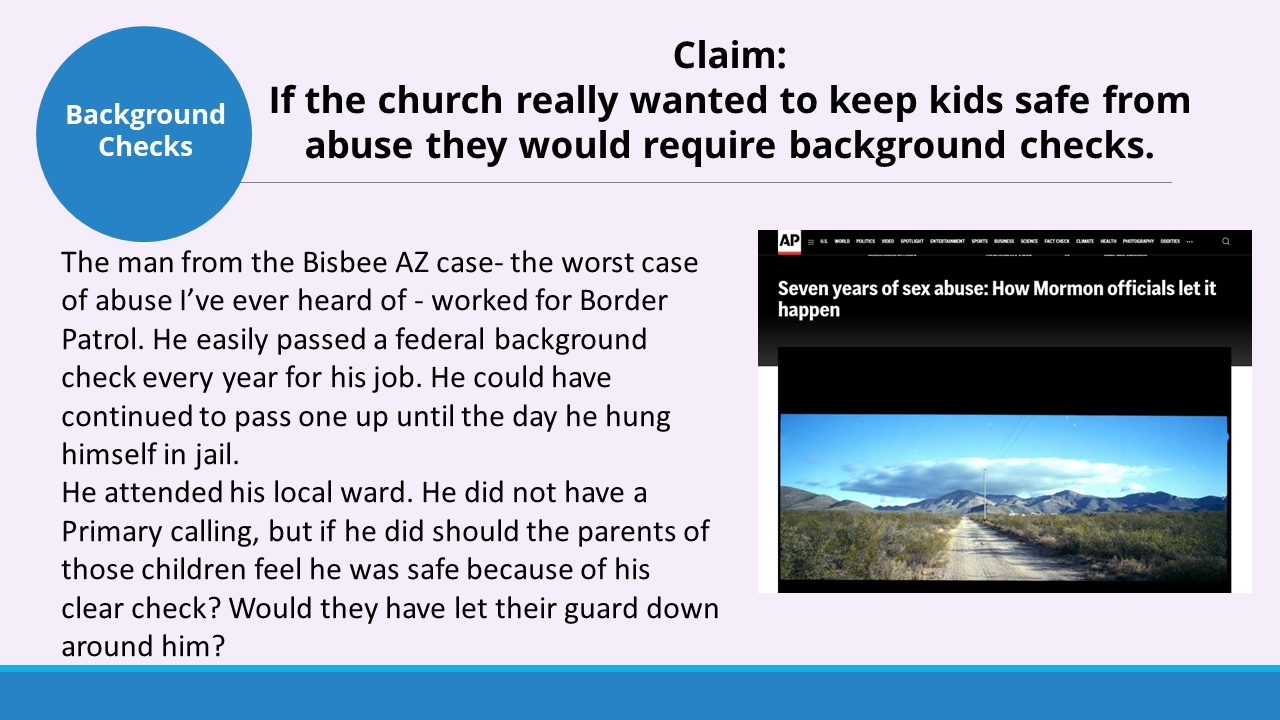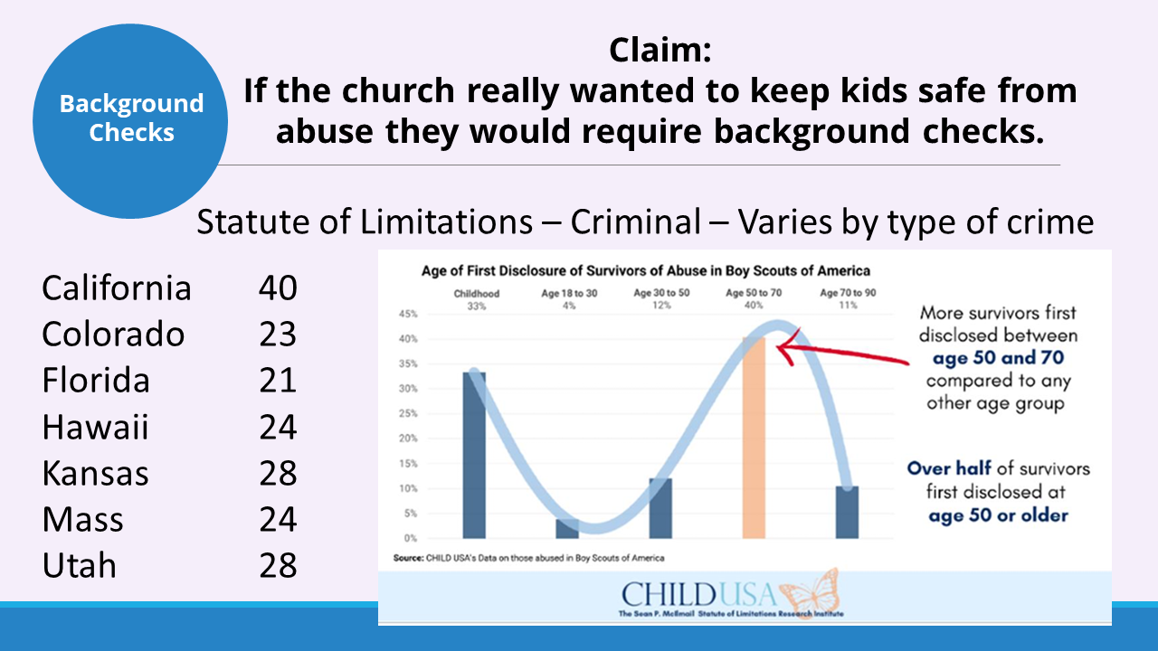 So, the claim, “If the church really wanted to keep kids safe from abuse, they would require background checks.” Here’s my evidence. We must do a better job educating people that “he has a clean background check” is identical to “we didn’t find anything on his record,” because it’s going to clue parents in differently about their responsibility of still watching over their own children.