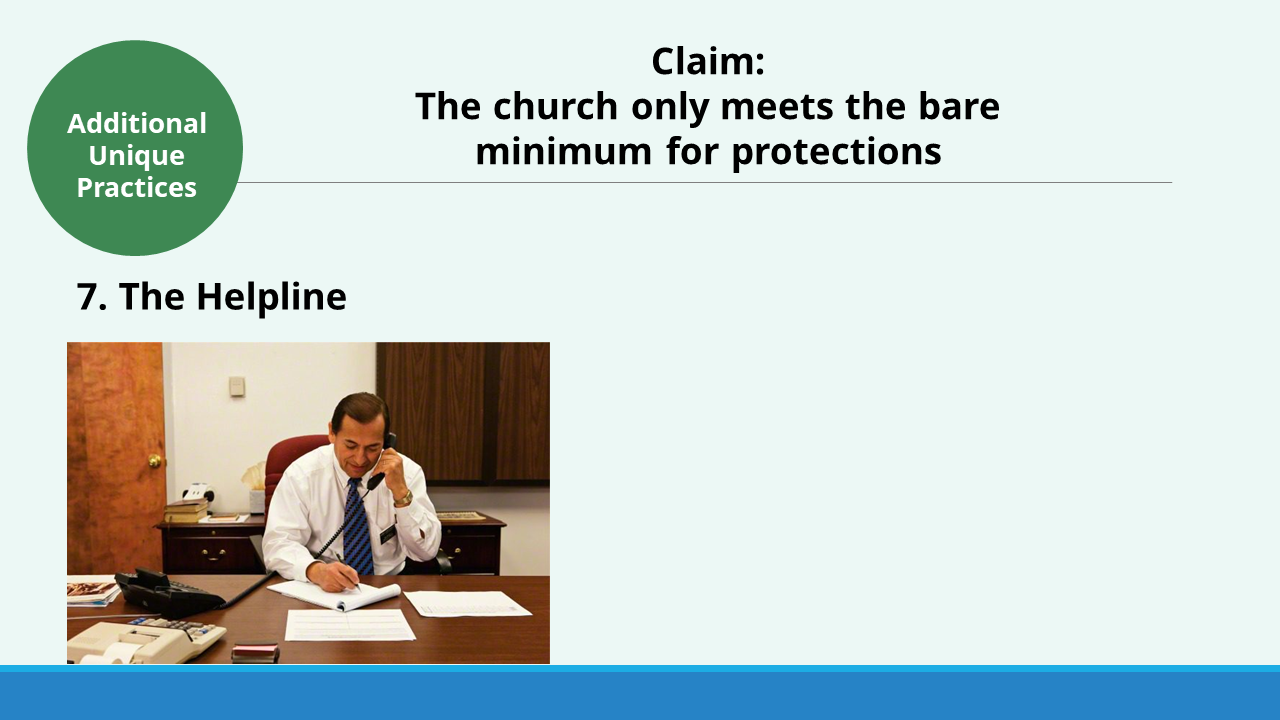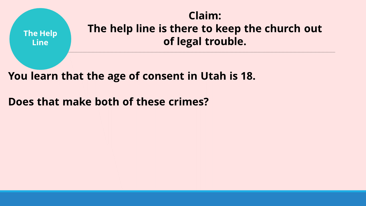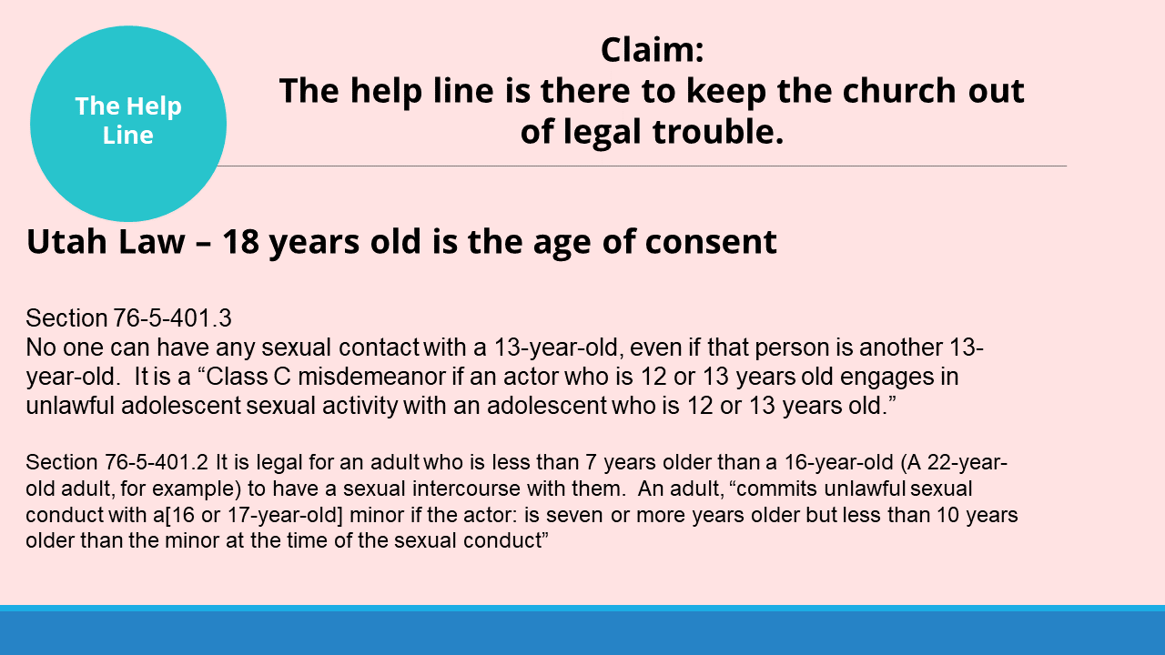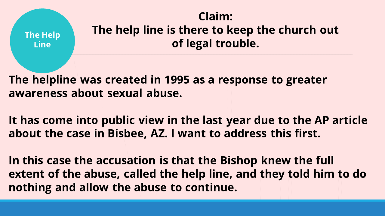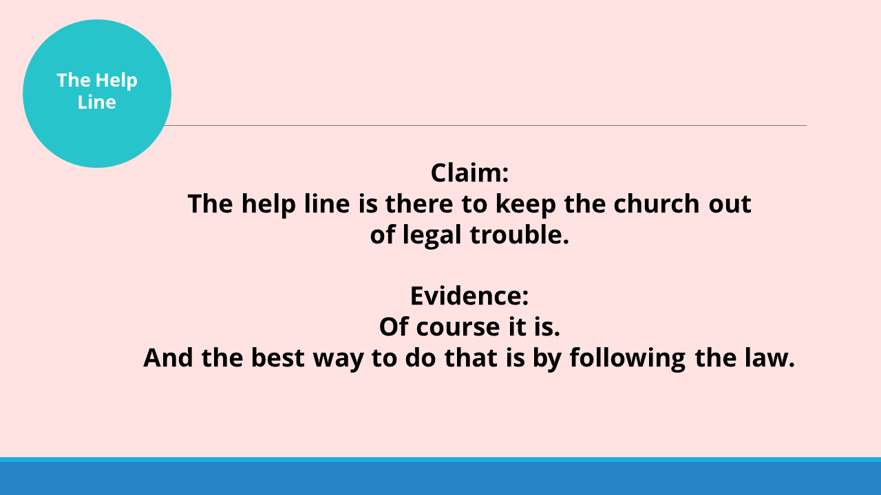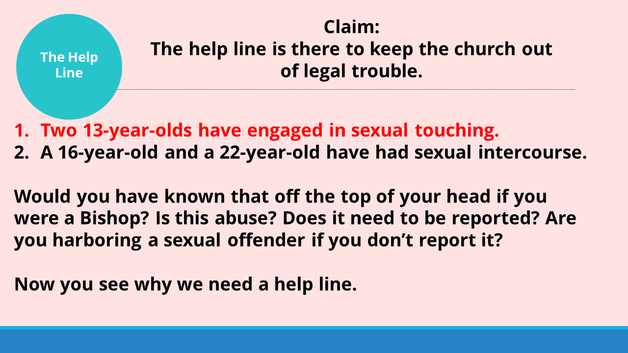 So the claim “the helpline is there to keep the church out of legal trouble,” here’s my evidence — of course it is! Do you know what the best way to stay out of legal trouble is? Follow the law! So yeah, the abuse helpline is there to help people do that. It’s also there to help care for victims. But you bet it’s there to keep the church out of legal trouble and it’s doing that by explaining to people (like you and me who are not lawyers) “Here’s what you need to do.”