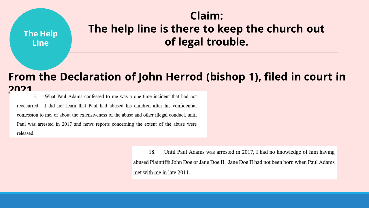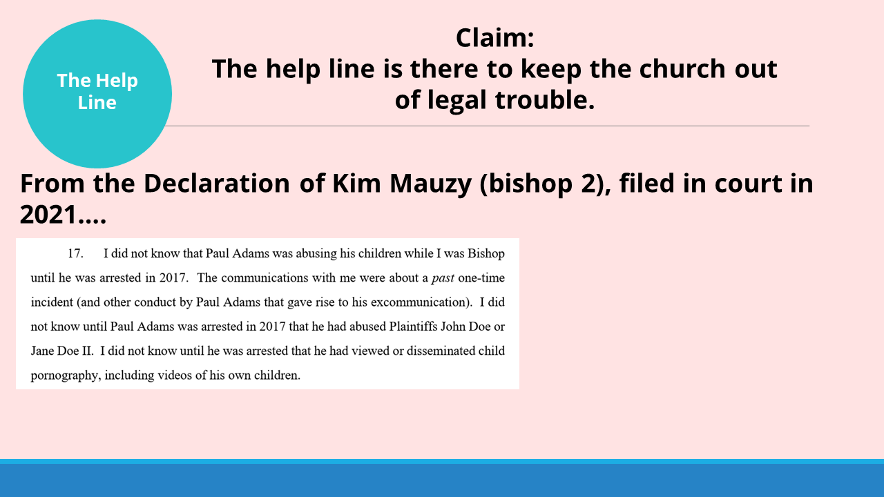 Back to the helpline. So, the accusation is that the helpline is there just to keep the church out of legal trouble. It’s a weird claim, made in the context of this Arizona case, Paul Adams, the abuser — he was not a leader in our church, of any kind. He barely attended. He’d only ever received the Aaronic priesthood. He had not been endowed. He didn’t hold a calling. He was no leader whatsoever in our church. Quite frankly, if the church was trying to protect our reputation, it would have just hung that guy out to dry, right? They’d gain nothing from protecting a man like that. So, the claim that the helpline told the bishops, “Oh, you must protect our reputation. You must protect the reputation of this man who comes twice a year.” It’s laughable.