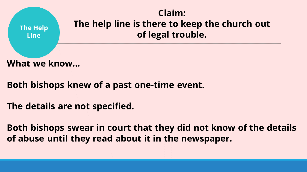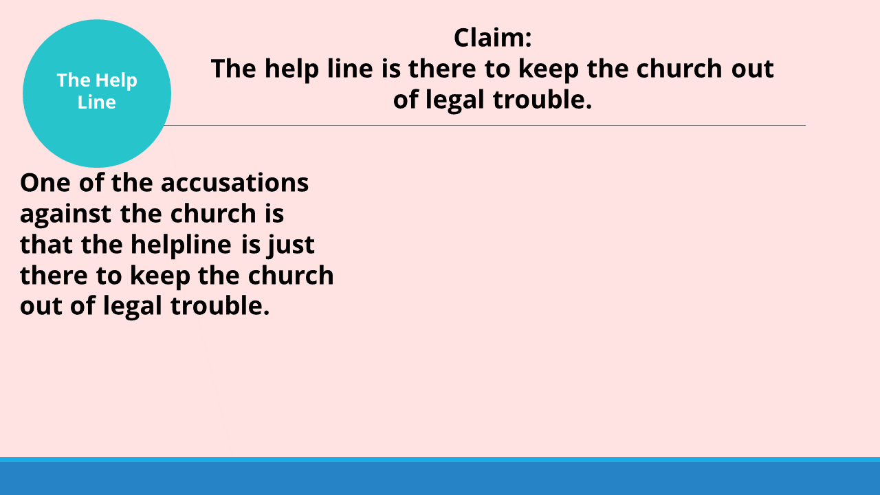The current accusation is that the helpline exists just to get the church out of legal trouble: it exists to hide abuse. This accusation is upsetting to many, many people, including people who are faithful members of this church. And I understand why! That’s a vile claim — that our church would have institutionalized something to protect our own reputation at the expense of children. The accusation is vile. But is it true?