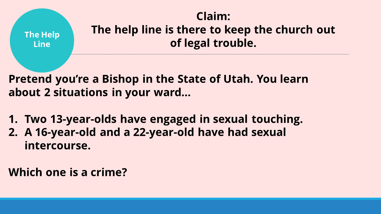 The two 13-year-olds engaging in sexual touching is the crime here. The 16-year-old and the 22 year old is actually not a crime. It’s allowed for in the current Utah statutes. Would you have known that off the top of your head if you’re a bishop? Is either one of these abuse? Does it need to be reported? Are you harboring a sexual predator if you don’t report it? Do you see why we need a helpline? Because that confused me.