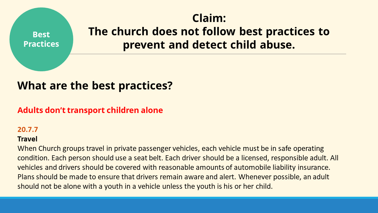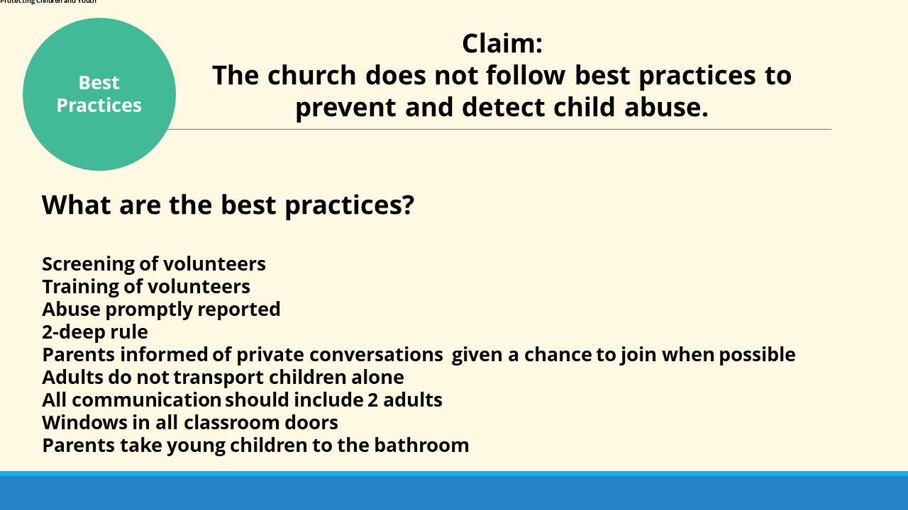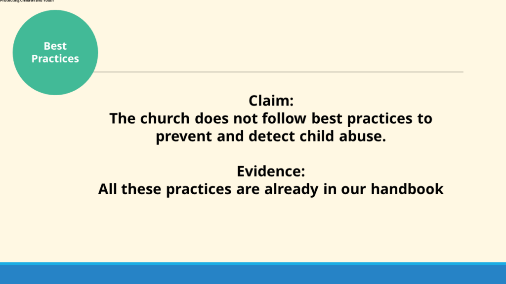 We’re going to go through this one super quick because I’m almost out of time (as every other speaker has said this week). Best practices, here they are: screening of volunteers, training of volunteers, abuse is properly reported, two-deep rule (that means two adults at a time anytime there are children or teens around), parents informed of private conversations and given a chance to join when possible, adults do not transport children alone. All communication should include two adults, windows in all classroom doors, and parents are taking the youngest children to the bathroom. I don’t have time to go through all of these; I went through and pulled out — these are all listed in our handbook. This is nothing new. If you have taken the church’s training for youth and children you know all of these. We very, very easily follow these best practices. So the question that is quite a bit more interesting. (Hang on, I gotta scroll it to where my notes are because I have to scroll past all of these that I was going to tell you about in detail. I think you can see my notes later when you see this presentation).