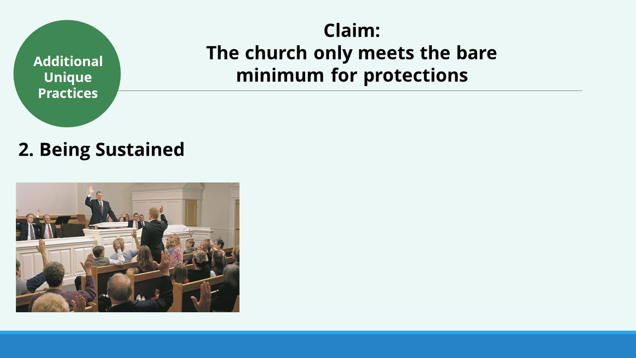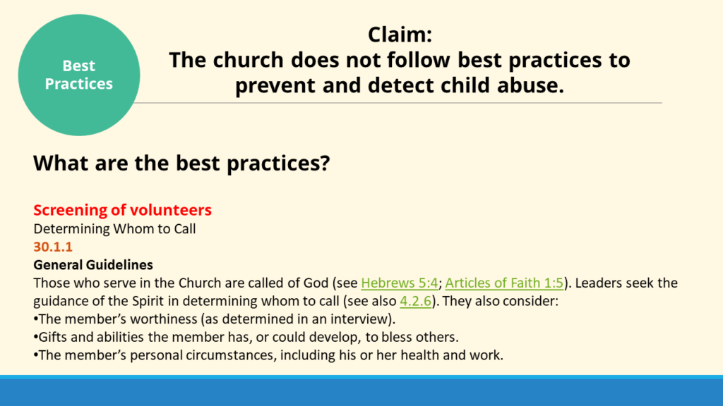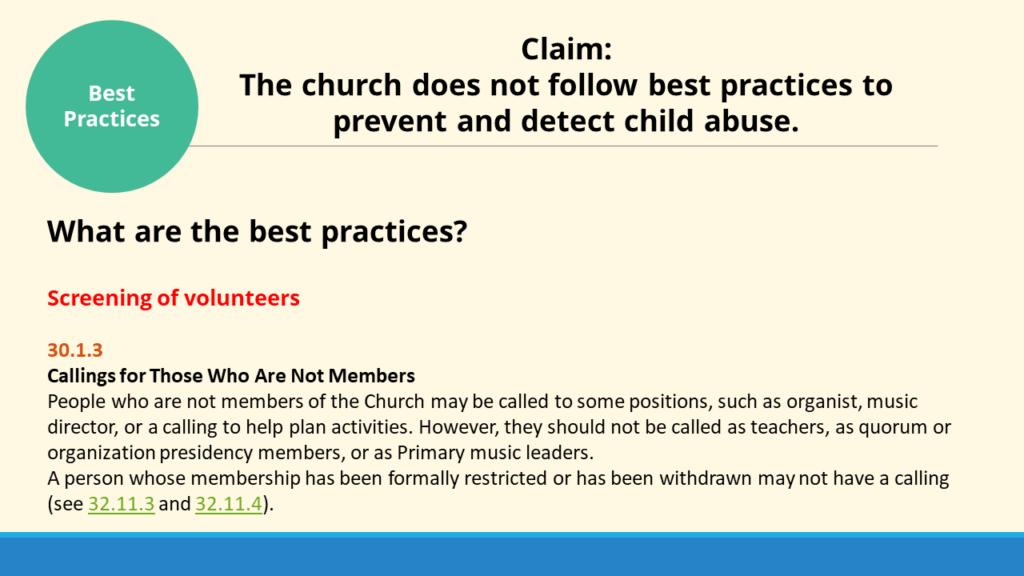 Being sustained. That to me this is the most hysterical one because we do this just — you know, like, every Sunday we sustain all the new callings, right? And we never think of this as a child protection. Let me tell you why it is. In a lot of churches, someone could volunteer to work with children and the rest of the congregation would never know. But if a guy over here volunteers, and a person over here actually has some information about some of the sketchy things they’ve done with children, in our church — maybe that person doesn’t have the confidence to raise their hand and object in the middle of sacrament meeting, but they know they can go talk to the bishop about it. And in most other churches, if you don’t have a kid, you don’t know who volunteers with the kids. So, if you have information about them you, don’t even know that you should be giving it.