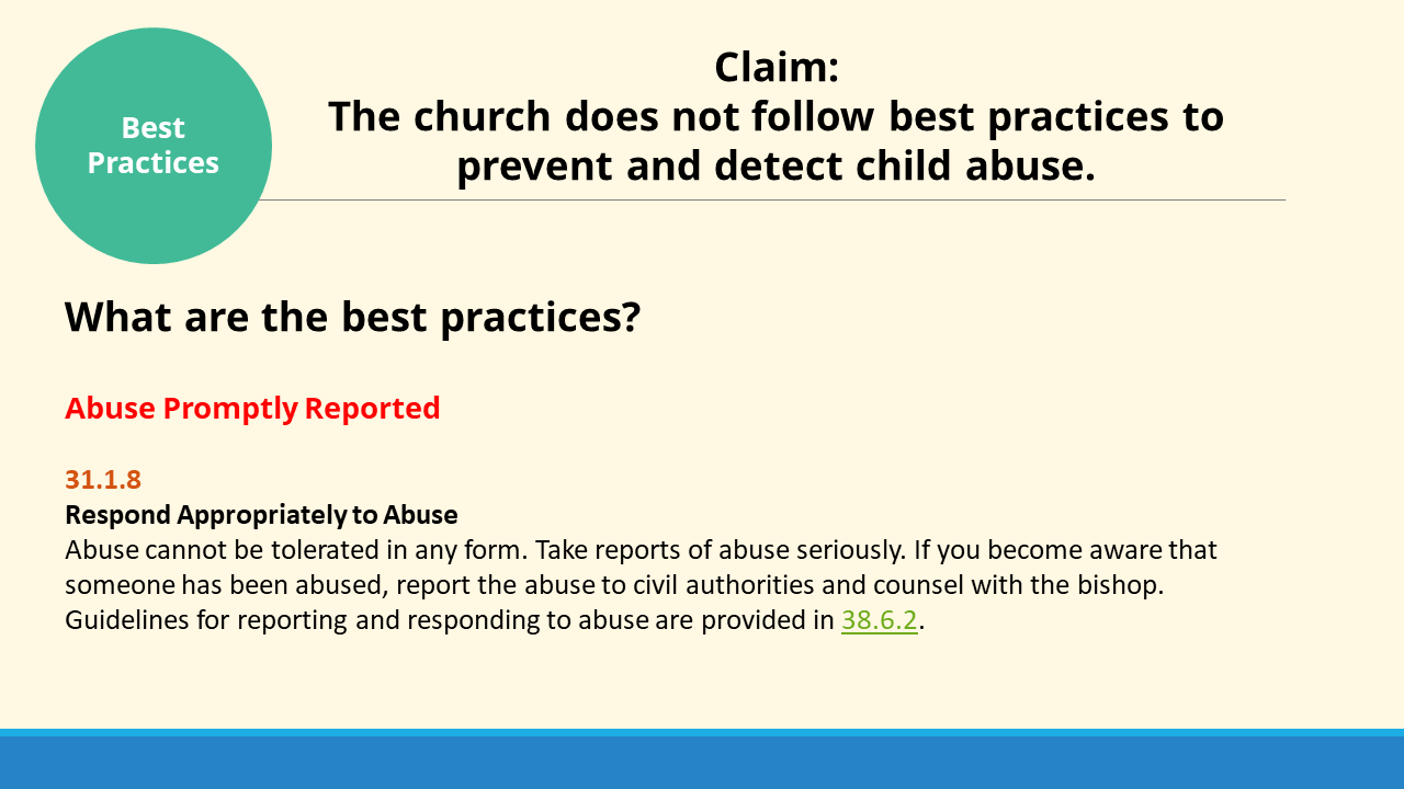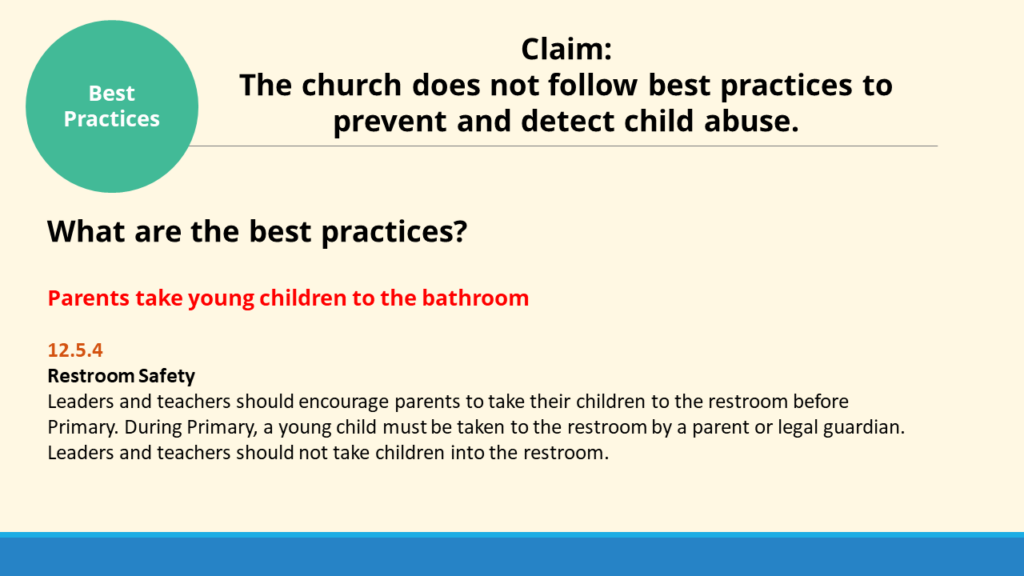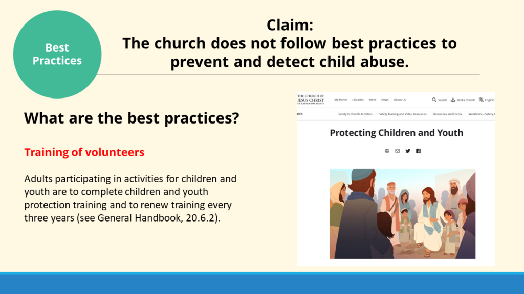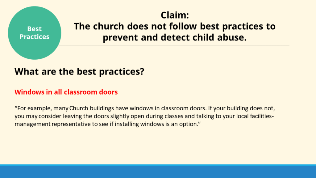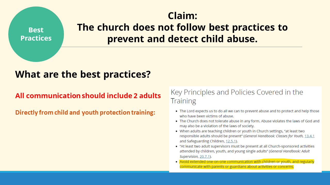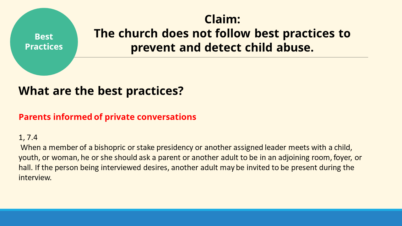 Yeah, reference back to my 2020 FAIR talk, it is all about Bishop interviews. Honestly, I did not include this in this talk, just because I covered it so much back then. There are very, very few places where teenagers get to say something in private to an adult who might know what to do. If I would have had a bishop interview when I was 16 years old, my life would have turned out really different. A bishop interview is an opportunity for a kid to disclose. I mean, I know the claim — the claim is that even asking teenagers about chastity — that in and of itself is abuse. It’s not. That’s not abuse, but it does give you a chance to listen to what a kid has to say. And maybe ferret out if something weird is going on.