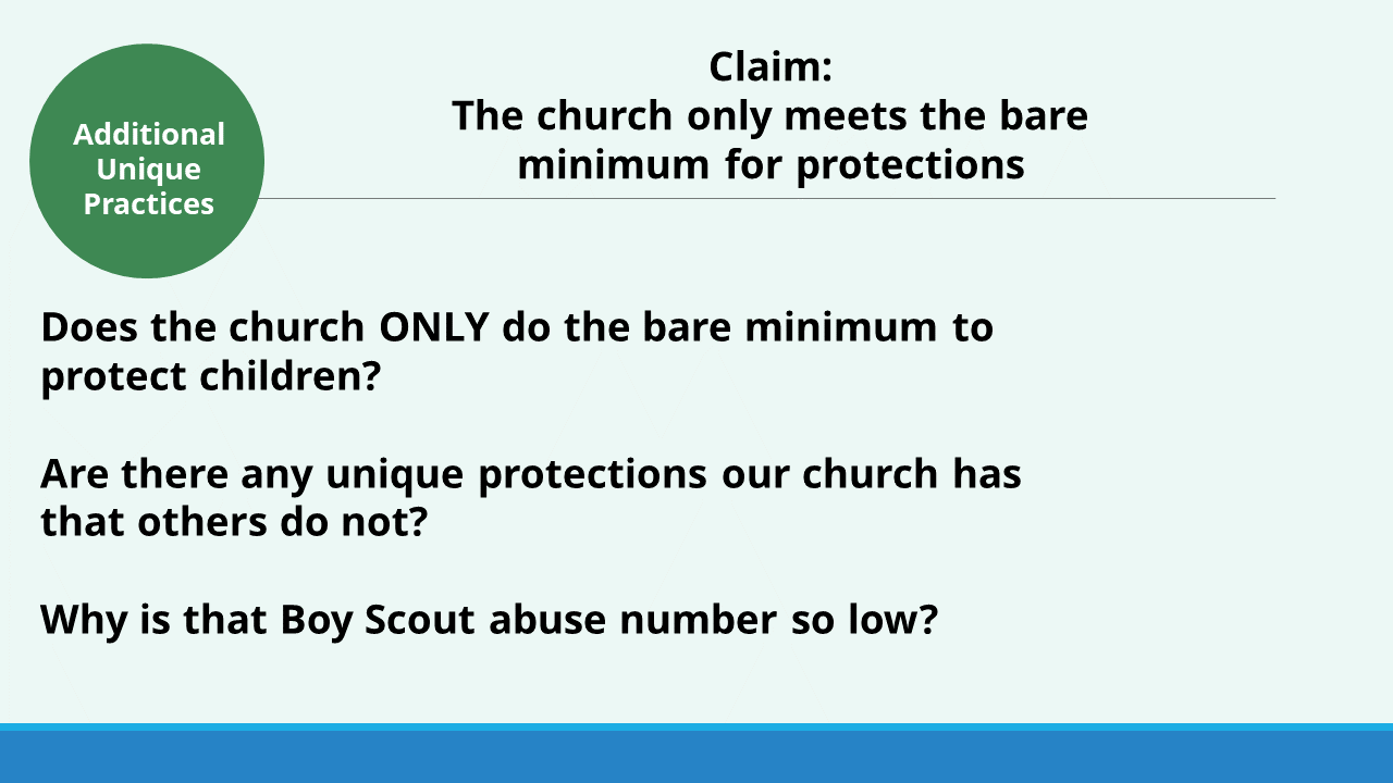 The more interesting question is: are we doing anything that’s above this gold standard, which actually ironically, has sort of become the bare minimum — everybody does those things. All the things on that list? Every church does those, everybody cares about stopping sexual abuse. We’re not something special because we do those things. And, and those things are not what’s driving a number like that 5.16% to be so low, because if they were everybody would be having a low number like that and they don’t — so what are we doing that’s different?