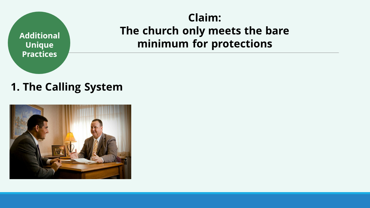 Some of these, you might laugh — and I’m okay with that — because you will not recognize them as protections that our church has for children, but they are. Number one is the calling system.