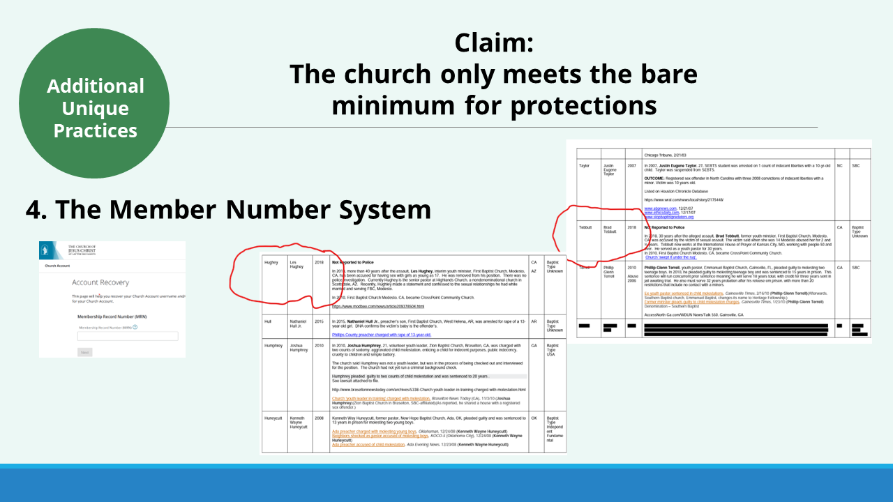 I’m gonna tell you this because I just really want to, about 10 years ago, the Southern Baptists were being pressured by a group of advocates to create a member number system exactly for this reason, so that abusers could be tracked, and they refused. They said, “We have 14 million members. There’s no way we could track all of them.” And then what they did was they started keeping a “secret list” of those abusers, and they kept it at their headquarters, and they didn’t tell the local leaders and they knew exactly who those abusers were. Seen here on this slide, the two red circles. Those are two pastors of the church I grew up in. They’re on the Southern Baptist list. Right? Your member number — I know you don’t think of that as a child protection, but it absolutely is.