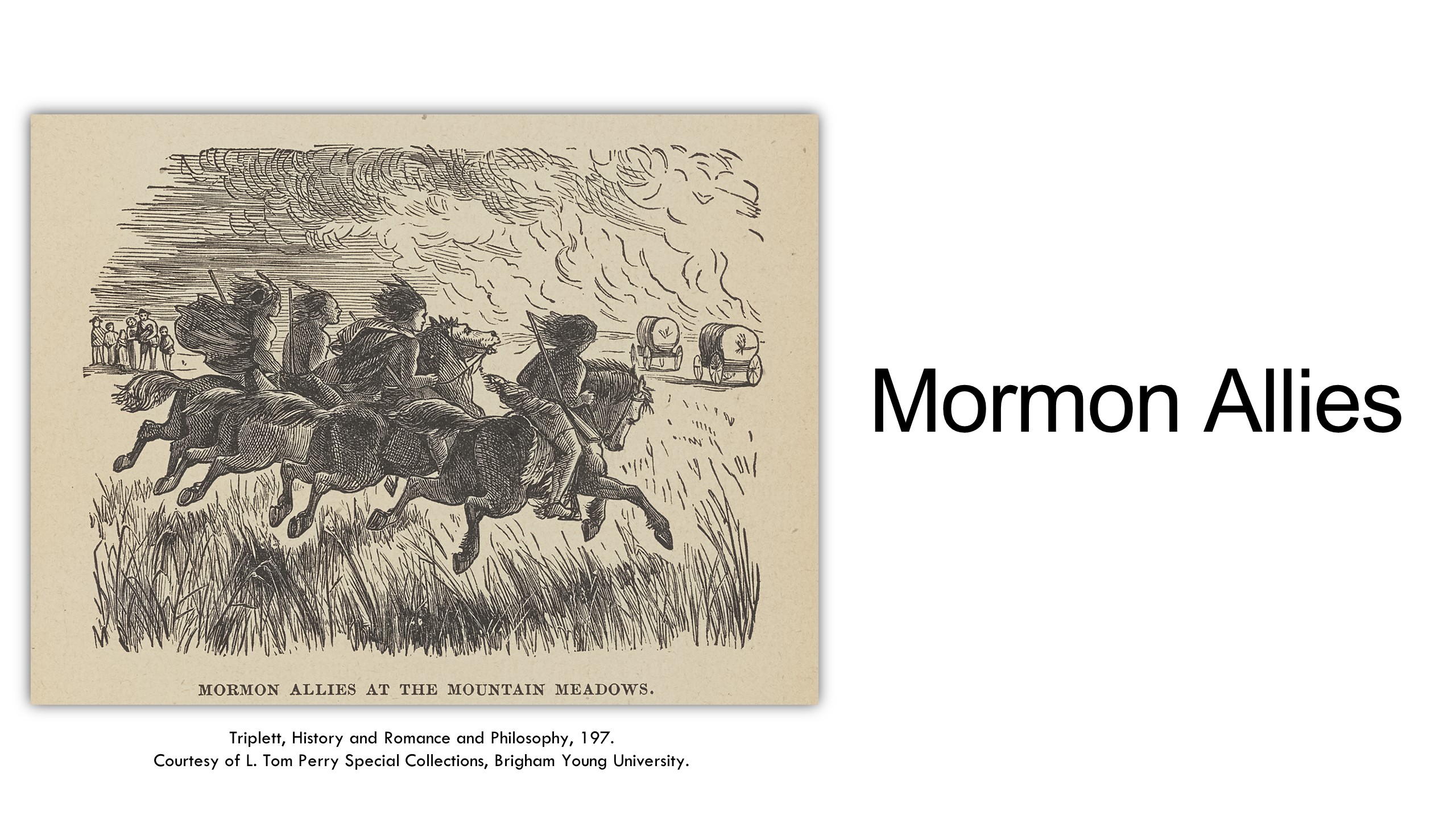 These are Mormon allies at Mountain Meadows. That rather than civilization, where savagery is met with opposition, Mormons wanted— And this, of course, is a caricature of Native peoples in the 19th century—but that Mormons brought in and were allied with the Indians.