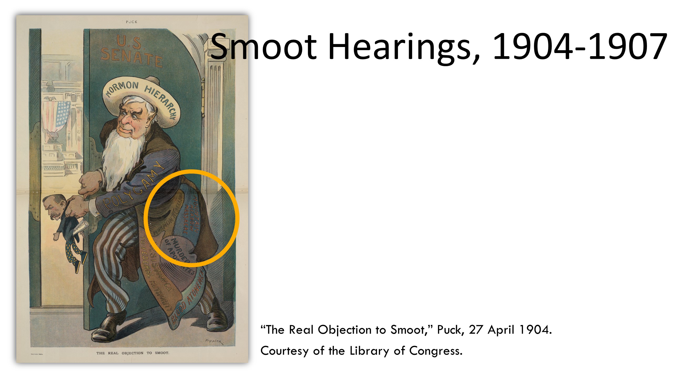This very striking political cartoon was on the front cover of—is on the front cover of my book. Some of you may have seen it before, from 1882. Mormonism in Utah: The Cave of Despair. So we have women dressed in kind of their traditional dress for many different countries with tags on them. Some of the tags say where they’re from. I think there’s one woman who’s from Norway. But most of them say sealed.