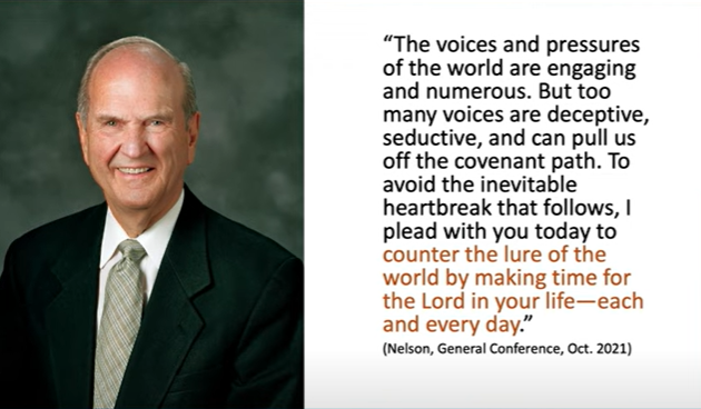 President Nelson has repeatedly emphasized this principle. He said, “The voices and pressures of the world are engaging and numerous, but too many voices are deceptive, seductive, and can pull us off the covenant path. To avoid the inevitable heartbreak that follows, I plead with you today to counter the lure of the world by making time for the Lord in your life each and every day.” Other times, he has said, “Give Him a fair share of your time.” Or “Give Him a generous portion of your time.”