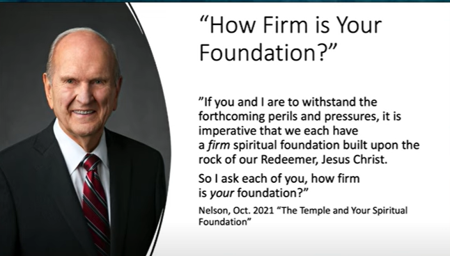 President Nelson said, “If you and I are to withstand the forthcoming perils and pressures, it is imperative that we each have a firm spiritual foundation built on the rock of our Redeemer, Jesus Christ.” So, I ask each of you, how firm is your foundation?