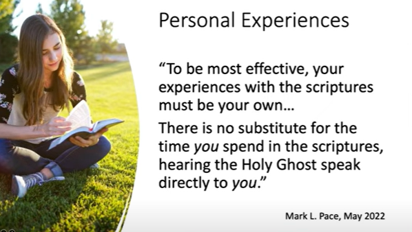 Elder Pace said, “To be most effective, your experiences with the scriptures must be your own. There is no substitute for the time you spend in the scriptures hearing the Holy Ghost speak directly to you.”