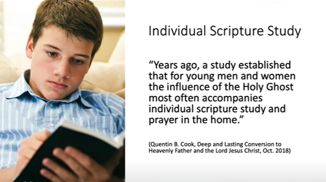 Years ago, a study established that for young men and women, the influence of the Holy Ghost most often accompanied individual scripture study and prayer in the home. It wasn’t the family scripture study. So when your teenager says, “I don’t want to do family scripture study,” say, “Good, you can just go do your personal scripture study.” It’s fine.