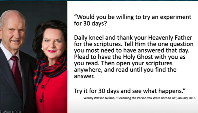 In fact, I’m going to let Sister Nelson, Wendy Watson Nelson, tell you. She was speaking to the youth battalion, I think—well, I think this was the talk where they called them the youth battalion. Okay, she’s speaking to the youth, and she said, “Would you be willing to try an experiment for 30 days?” And I’m extending this experiment invitation to you. She said, “Daily kneel and thank your Heavenly Father for the scriptures. Tell Him the one question you most need to have answered that day. Plead to have the Holy Ghost with you as you read. Then open your scriptures anywhere and read until you find the answer.”