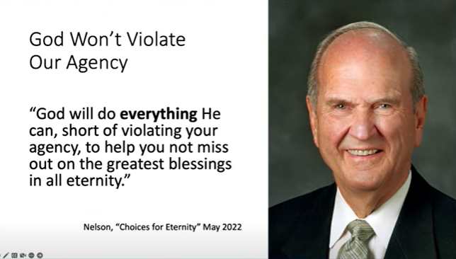 In fact, President Nelson said, “God will do everything He can—short of violating our agency—to help you not miss out on the greatest blessings in all eternity.” We must honor their agency as well. It’s what we fought for; it’s what we’re still fighting for. We want our agency, and we need to honor that.