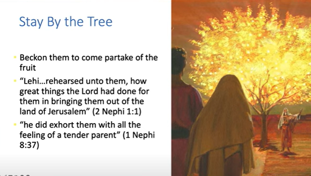 Another thing we can remember is to, like Father Lehi, stay by the tree. We don’t have to change because they’ve changed. Of course, we can be accommodating, loving, and sensitive, but in our families, in our homes, in personal worship, we can stay by the tree and beckon them to come and partake of the fruit. “Lehi rehearsed unto them how great things the Lord had done for them.” We can likewise do that; we can exhort them “with all the feeling of a tender parent.” Stay by the tree.