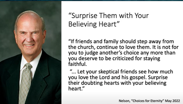 President Nelson said it beautifully: “If friends and family should step away from the Church, continue to love them. It is not for you to judge another’s choice any more than you deserve to be criticized for staying faithful. Let your skeptical friends see how much you love the Lord and His gospel. Surprise their doubting hearts with your believing heart.” Isn’t that good? Oh, don’t you just love President Nelson?