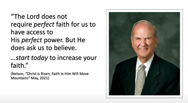 President Nelson taught, “The Lord does not require perfect faith for us to have access to His perfect power, but He does ask us to believe. . . Start today to increase your faith.”