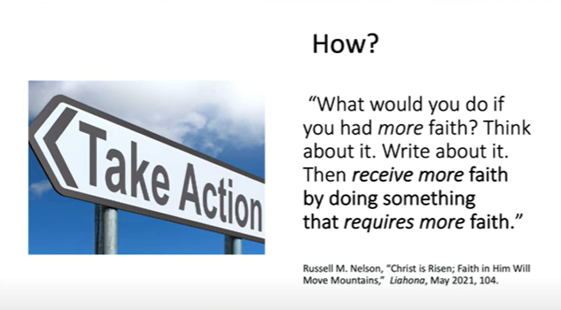He said, “What would you do if you had more faith? Think about it; write about it; then receive more faith by doing something that requires more faith.” Faith is a principle of action. When you take action, your faith can grow.