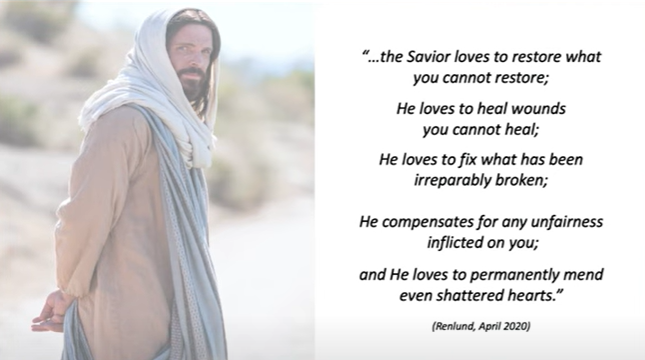 He loves to restore what you cannot restore, He loves to heal wounds you cannot heal, He loves to fix what has been irreparably broken. He compensates for any unfairness inflicted on you, and He loves to permanently mend even shattered hearts. Thank you, Elder Renlund, for that beautiful, eloquently put quote. He loves to bless us and to pull us out of our falls.