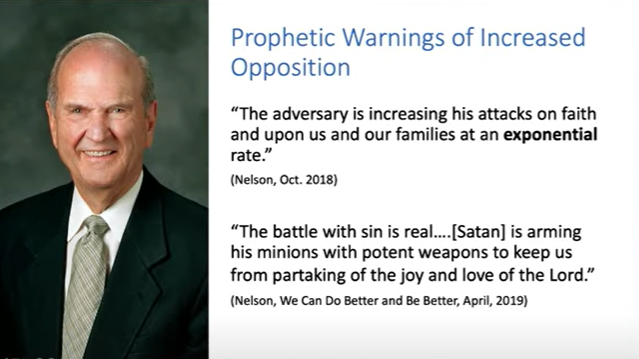 Our prophet, five years ago, warned us that “The adversary is increasing his attacks on our faith and on our families at an exponential rate.” Exponents get large really quickly, so that can be a really scary quote. Then,the one below it: