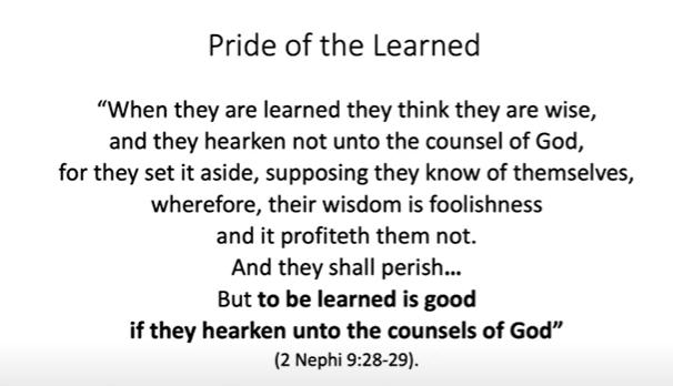 “When they are learned, they think they are wise, and they hearken not unto the counsel of God, for they set it aside, supposing they know of themselves; wherefore, their wisdom is foolishness, and it profiteth them nothing, and they shall perish. But to be learned is good if they hearken unto the counsels of God.”