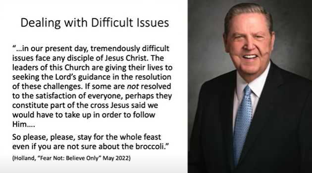Elder Holland reminds us that, “. . . in our present day, “tremendously difficult issues face any disciple of Jesus Christ. The leaders of this Church are giving their lives to seeking the Lord’s guidance in the resolution of these challenges. If some are not resolved to the satisfaction of everyone, perhaps they constitute part of the cross Jesus said we would have to take up in order to follow Him. . . So please, please stay for the whole feast, even if you’re not sure about the broccoli.” Remember that one?