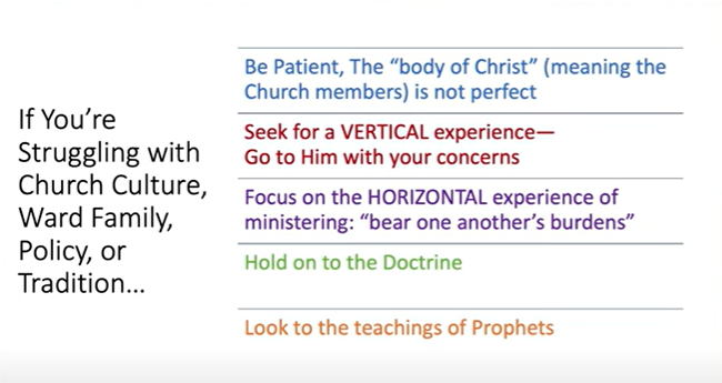 Seek to have a vertical experience when you go to church—seek to hear God speak to you. When you’re there with that horizontal experience in your ward family, where you may have issues with certain things or people, focus on ministering. Look for someone who needs you. Don’t focus on imperfections or things you dislike about how others serve in their callings. Hold to the doctrine, and look to the teachings of the prophets, as we’ve talked about already.