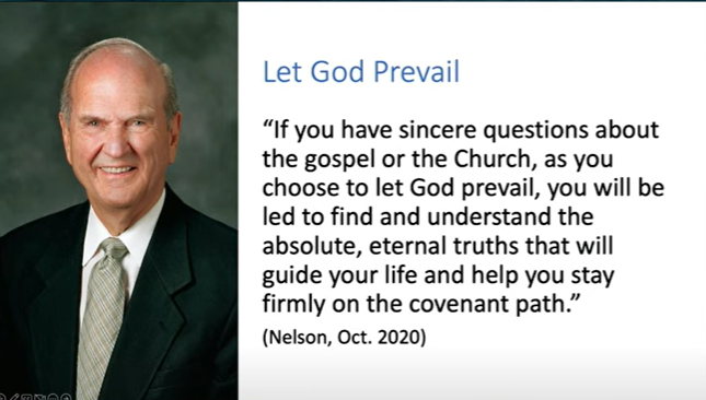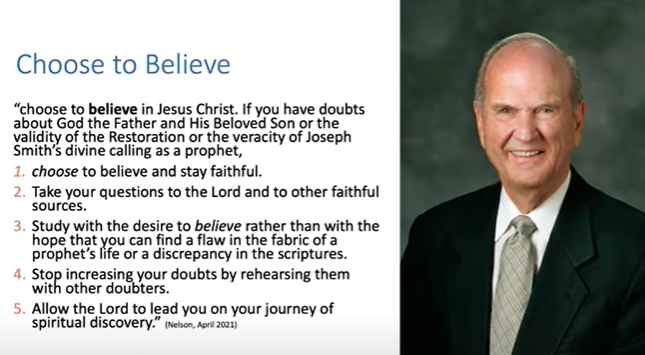 President Nelson said—numbers added here for emphasis—“Choose to believe in Jesus Christ. If you have doubts about God the Father and His Beloved Son, or the validity of the Restoration, or the veracity of Joseph Smith’s divine calling as a prophet, [and I would insert or anything else about the gospel], 1. choose to believe and stay faithful. 2. Take your questions to the Lord and to other faithful sources. 3. Study with the desire to believe rather than with the hope that you can find a flaw in the fabric of a prophet’s life or a discrepancy in the scriptures, 4. Stop increasing your doubts by rehearsing them with other doubters, and 5. Allow the Lord to lead you on your journey of personal discovery.”