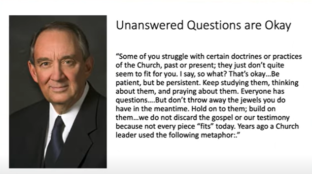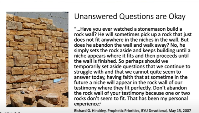 “So perhaps we should temporarily set aside questions we continue to struggle with, those we cannot quite seem to answer today, having faith that sometime in the future, a niche will appear in the rock wall of our testimony where they fit perfectly. Don’t abandon the rock wall of your testimony because one or two rocks don’t seem to fit. That has been my personal experience.”