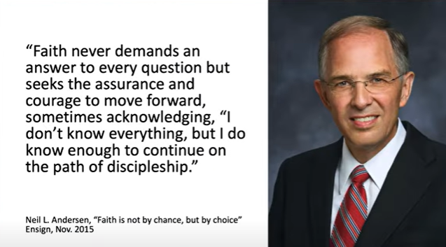 Elder Andersen said, “Faith never demands an answer to every question but seeks the assurance and the courage to move forward, sometimes acknowledging, ‘I don’t know everything, but I do know enough to continue on the path of discipleship.’”