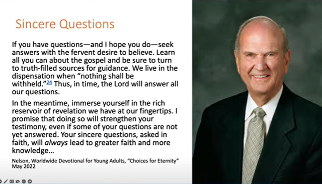 This is President Nelson. He said, “If you have questions—and I hope you do—seek answers with a fervent desire to believe. Learn all you can about the gospel and be sure to turn to truth-filled sources for guidance. We live in the dispensation when nothing shall be withheld; thus, in time, the Lord will answer all our questions. In the meantime, immerse yourself in the rich reservoir of revelation we have at our fingertips. I promise that doing so will strengthen your testimony. Even if some of your questions are not yet answered, your sincere questions asked in faith will always lead you to greater faith and more knowledge.”