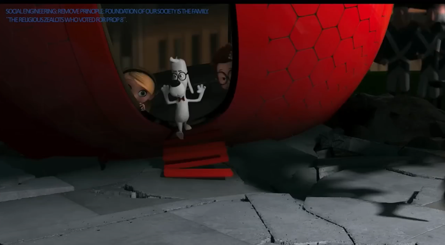 That was it. This was the character. This was the social engineering. And amazingly—and applause to DreamWorks—once I brought this all up with them, they took it out. So, I’d like you to give a round of applause to them for saving the Proclamation on the Family in this movie, which millions of children all over the world—every country—watch. I talk to people I’ve never met about these characters and these things that happen. They all know them. And they took it out.
