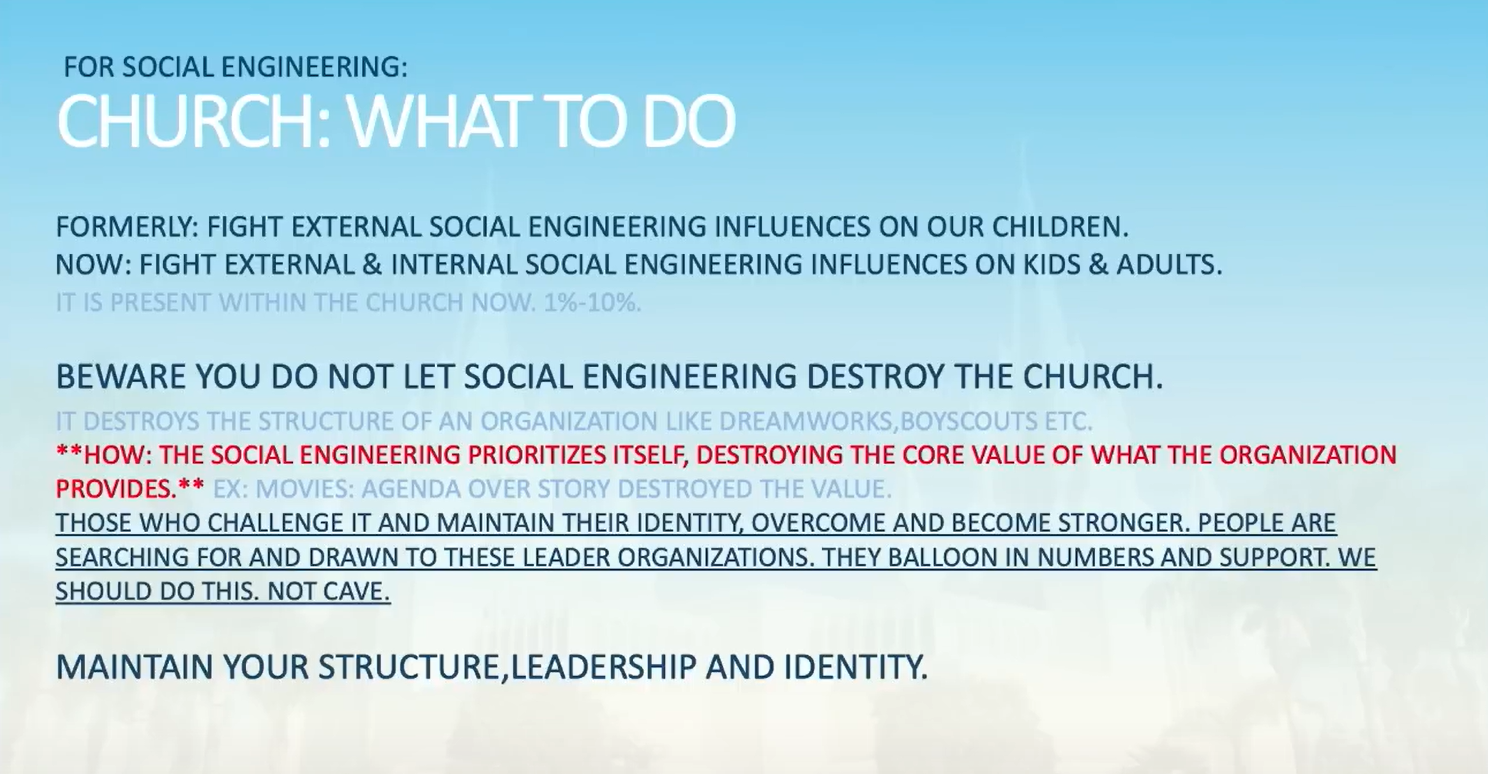 I believe social engineering is a close sister to what you know as priestcraft—a close relative. It’s interesting how it has the ability to destroy whatever organization or culture it weaves itself into.