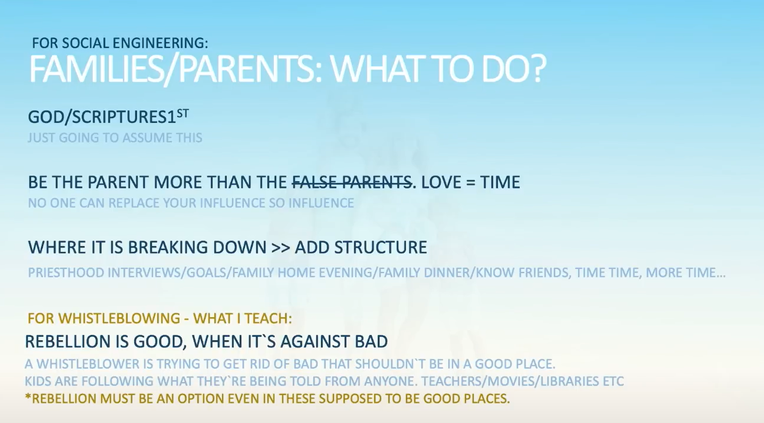 Using his own experience at DreamWorks, he exposes how social engineering manipulates narratives, particularly targeting children, to reshape societal perceptions and dismantle core values, and calls for individuals to counter these influences by embracing their roles as righteous leaders, fostering strong family units, and working to create a Zion-like society.