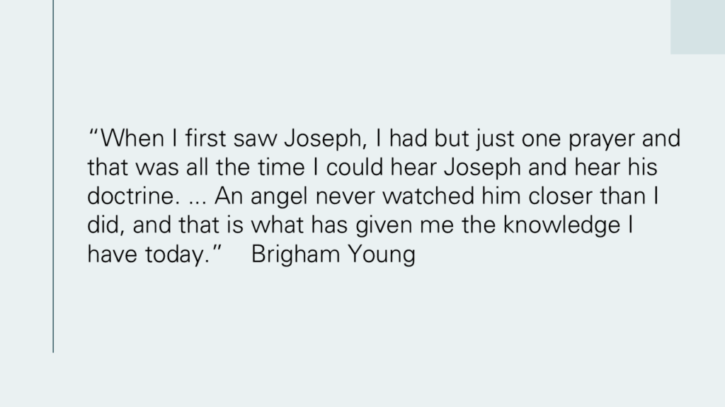 When I first saw Joseph, I had but just one prayer and that was all the time I could hear Joseph and hear his doctrine. … I would watch him; I was with him several years before I ever opened my mouth. I was with him when [he] received revelation and so was Brother Kimball and others. … An angel never watched him closer than I did, and that is what has given me the knowledge I have today.”