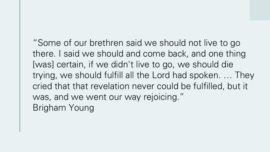The experience he gained on Zion’s Camp, watching Joseph Smith and learning from him how to lead a group of people, became invaluable four years later, when Joseph Smith was imprisoned in the Liberty Jail and Brigham Young and the Twelve had to direct the Saints’ removal from Missouri to Illinois, and then again years after that when he had to direct the emigration to the Salt Lake Valley.