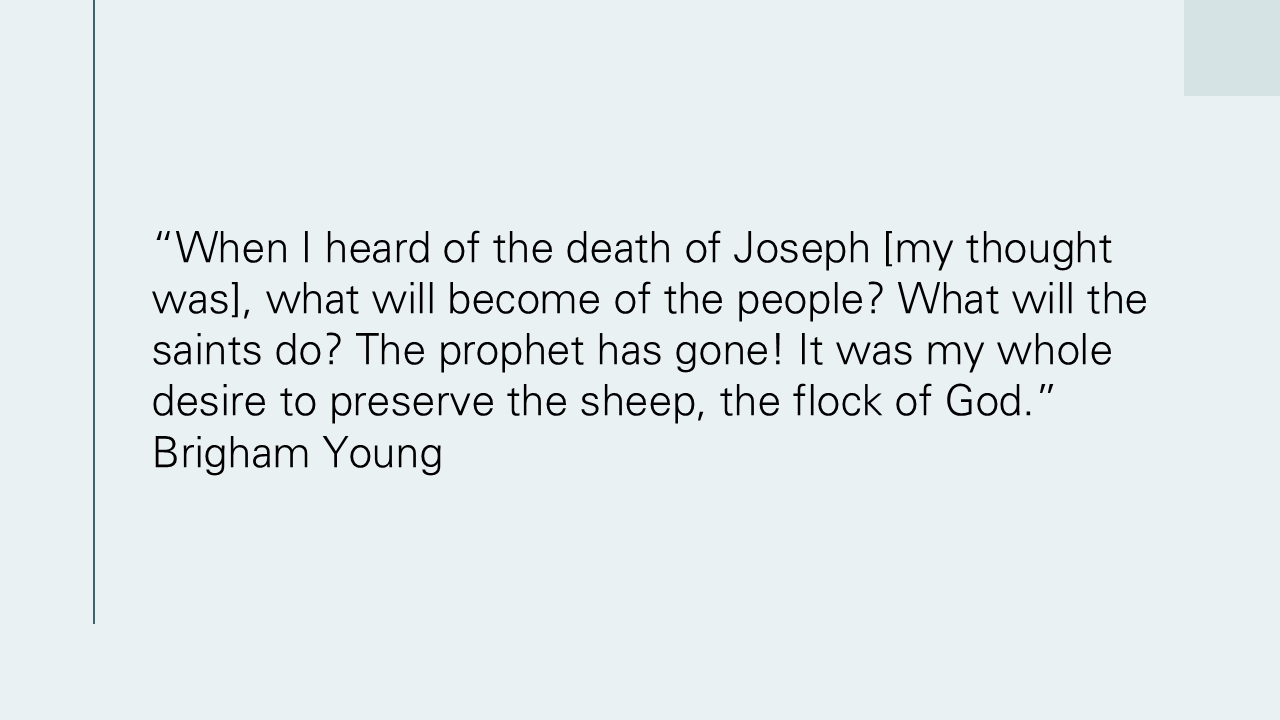 When I heard of the death of Joseph [my thought was], what will become of the people? What will the Saints do? The prophet has gone! It was my whole desire to preserve the sheep, the flock of God. This was my desire and my whole desire and it is so today: what can we do to preserve the flock of God.”