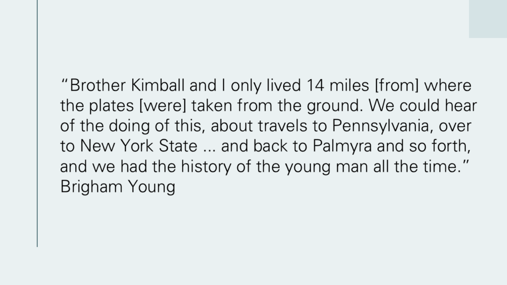 Although I was not a member of the church until [it was] 2 years old, yet I knew very well about Joseph Smith before he organized the church. Brother Kimball and I only lived 14 miles [from] where the plates [were] taken from the ground. We could hear of the doing of this, about travels to Pennsylvania, over to New York State … and back to Palmyra and so forth, and we had the history of the young man all the time.