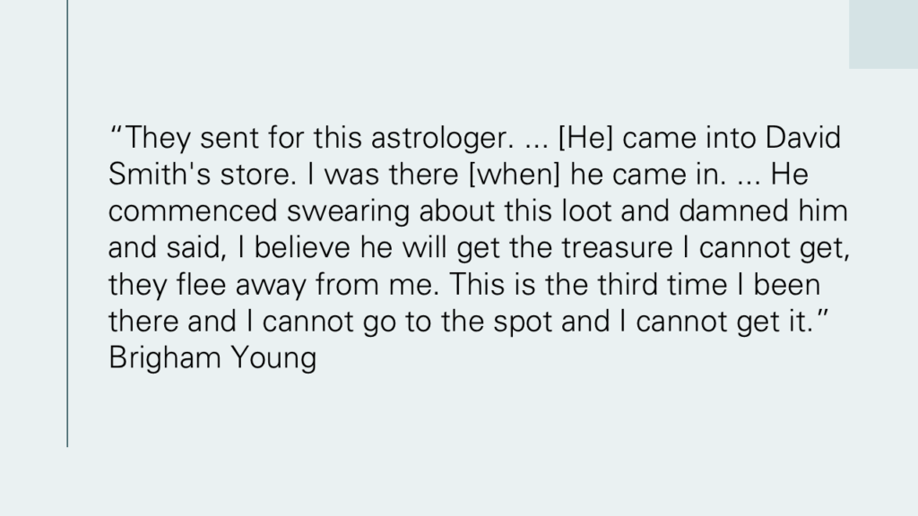 I knew one astrologer. I heard him say when Joseph was looking for the Book of Mormon, they was in the hill, and a number of men knew there was a treasure. … They sent for this astrologer, he was [the] smartest one ever I saw. … He went up the last time there, the last he goes on first of September, a few days before Joseph got the plates, [he] came into David Smith’s store.