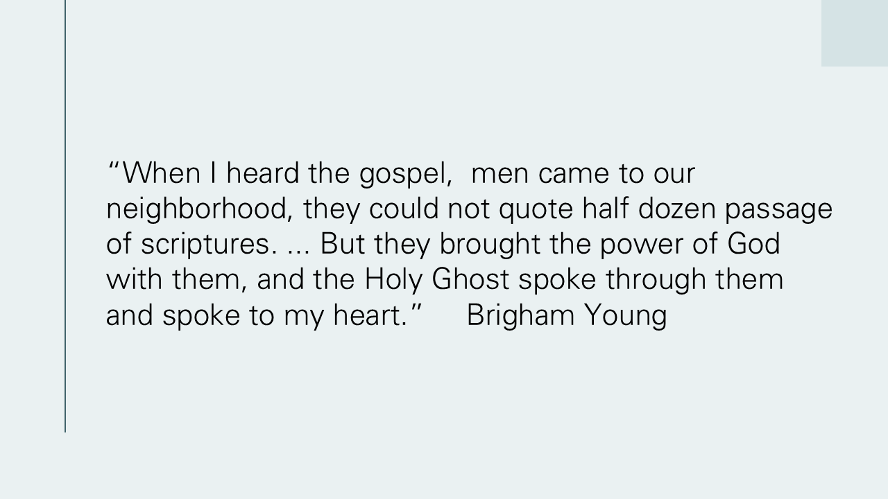 I praised Christ but disbelieved the religions of the day and [thought] that their practice [was] all folly and nonsense. … When I heard the gospel, men came to our neighborhood, they could not quote half dozen passage of scriptures, they could not talk longer than every brother here today, some 3 minutes some 11, 13 and 9, … but they brought the power of God with them, and the Holy Ghost spoke through them, and spoke to my heart.”