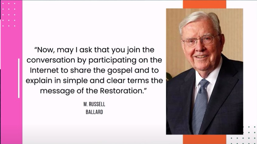 “Now, may I ask that you join the conversation by participating on the internet to share the gospel and to explain in simple and clear terms the message of the Restoration.”