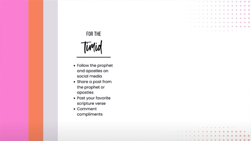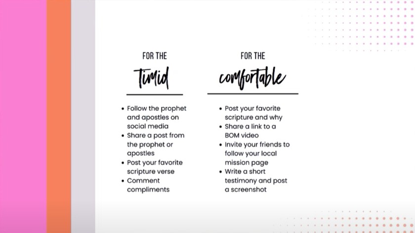 Okay, so if you’re feeling a little bit more comfortable about sharing the gospel, here are some ideas. Post your favorite scripture and why it’s your favorite scripture. Share a link to a Book of Mormon video. (Those new Book of Mormon videos that are on YouTube, post a link.) You could even post the video that kind of goes along with Come, Follow Me for this week.