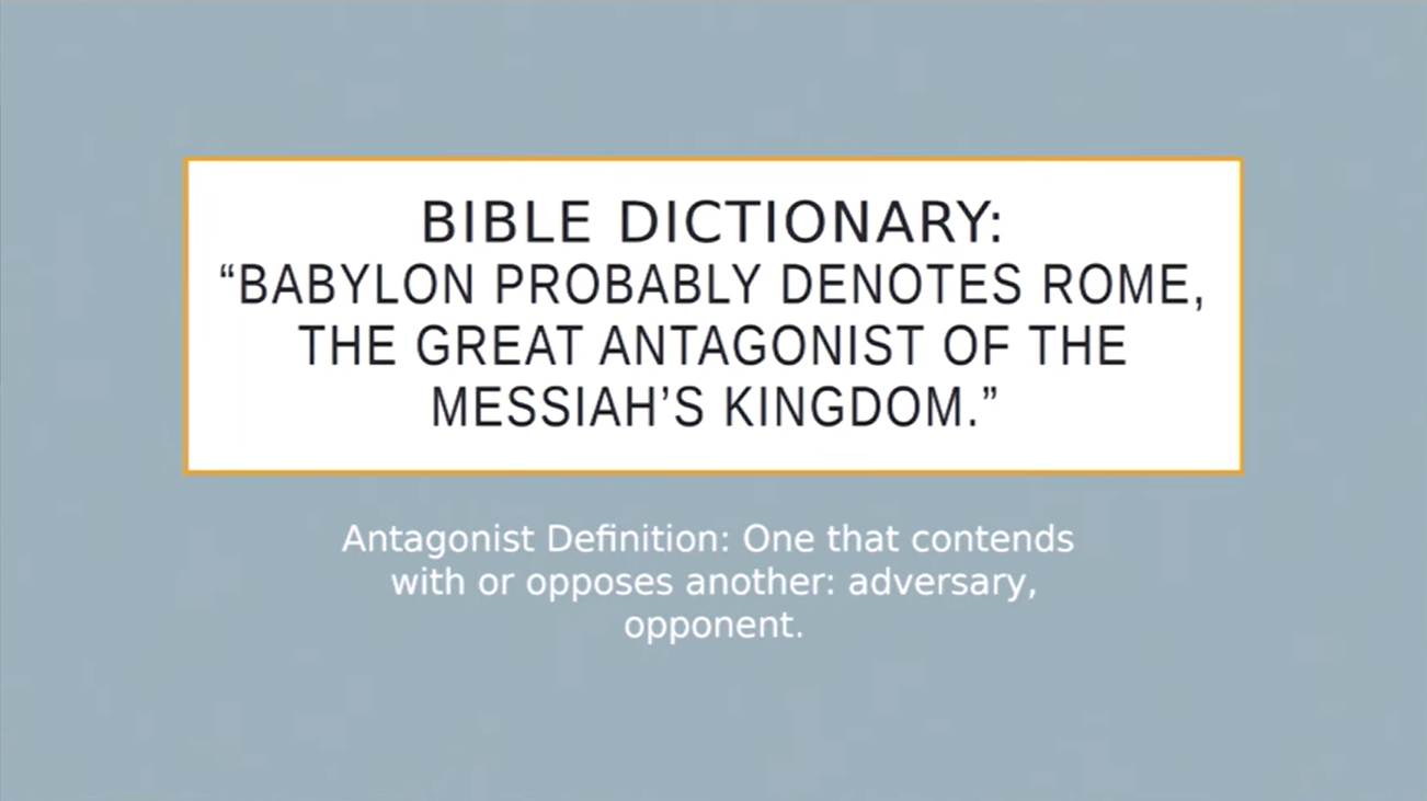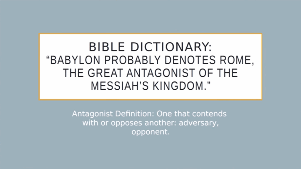 Another thing in the Bible Dictionary is it says Babylon probably denotes Rome—the great antagonist of the Messiah’s kingdom. I think “the great antagonist” is a pretty bold description. The definition of antagonist is ‘one that contends with or opposes another’.
