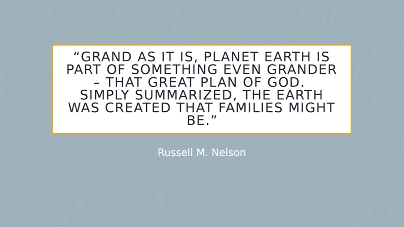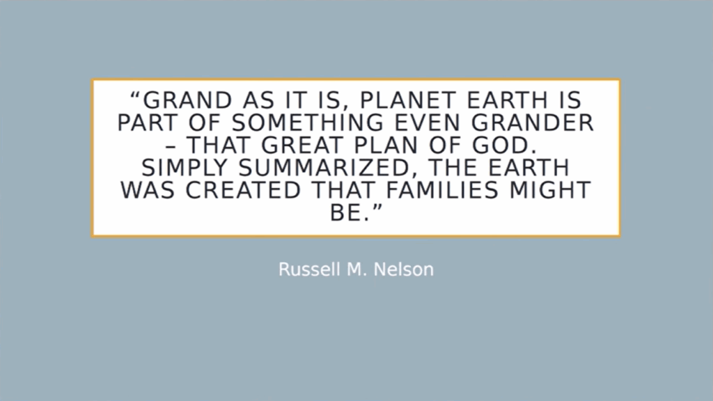 Grand as it is, Planet Earth is part of something even grander- that great plan of God. Simply summarized: the Earth was created that families might be.