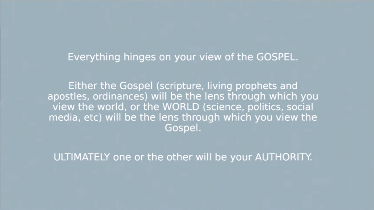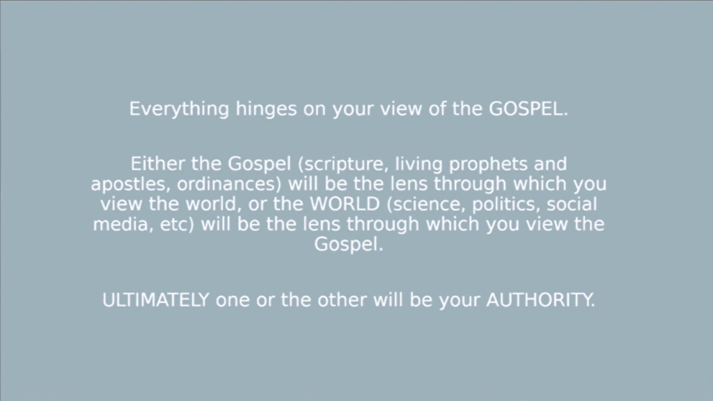 It says: Everything hinges on your view of the gospel. Either the gospel—which is scriptures, living prophets, apostles, and ordinances—will be the lens through which you view the world, or the world—science, politics, media, etc.—will be the lens through which you view the gospel. Ultimately, one or the other will be your authority.